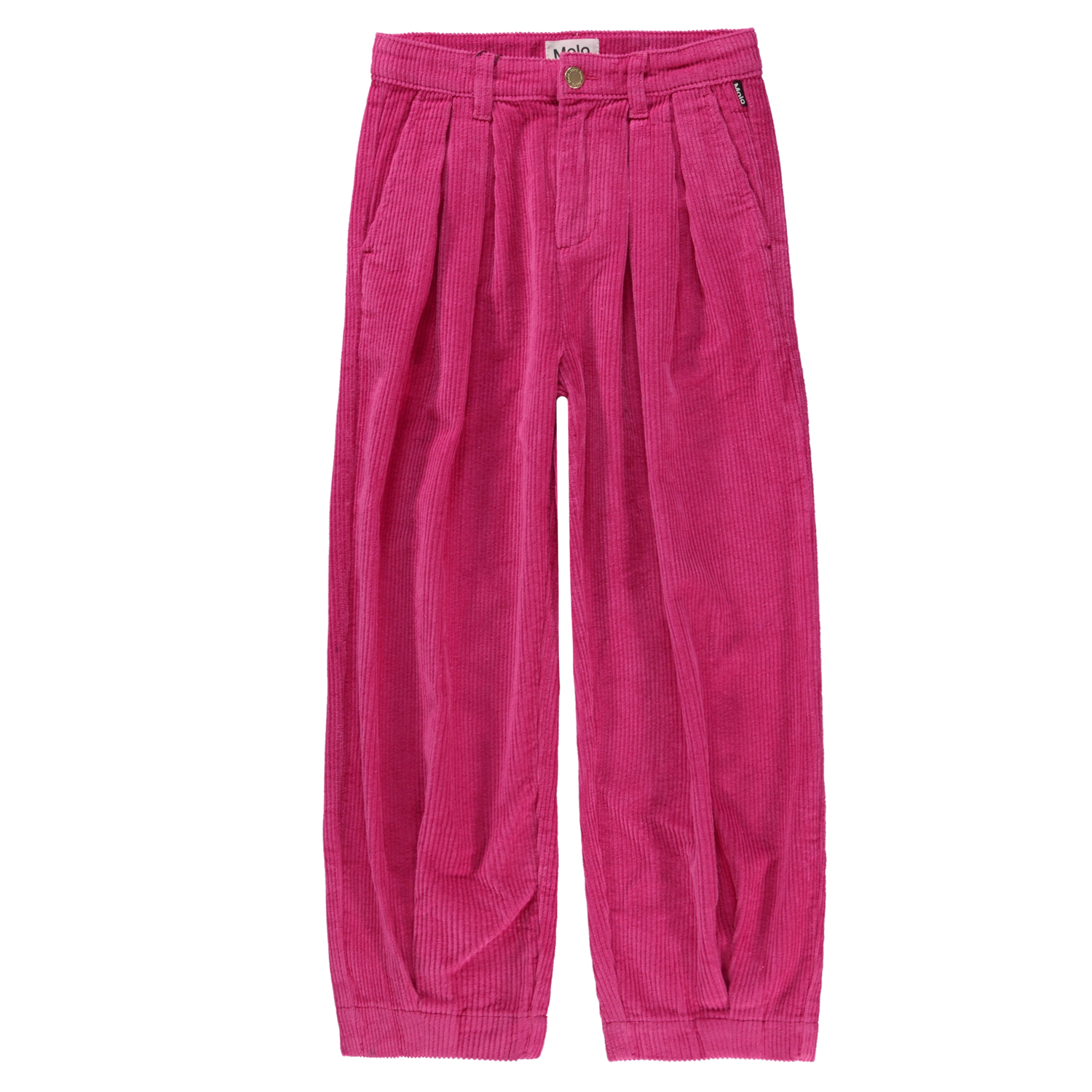 Pink bukser i riflet fløjl. Disse bukser er fremstillet i 100% bomuld, har wienerlæg øverst og nederst på buksebenet, hvilket skaber en god rummelighed. Bukserne har lommer i siden, baglommer, samt et loose fit. Buksernes livvidde kan justeres med en indvendig justerbar elastik, så de passer perfekt til alle børn. Str.92-134 har trykknap, så bukserne er nemme at få af og på - str.140-176 har regulær jeansknap.