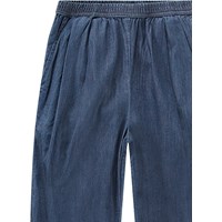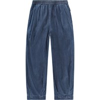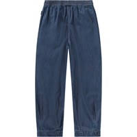 Denimblå bukser i økologisk bomuld. Bukserne har elastik i taljen, hvilket gør dem nemme at komme i og behagelige at have på. Der er også et læg fortil, som giver buksen fylde. Desuden har bukserne lommer i sidesømmen og indsyede snit i bunden, hvilket skaber en voluminøs effekt.
