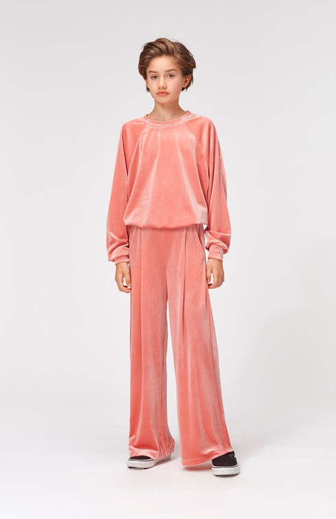 Alfa er et par rosa velour bukser med en løs pasform. Bukserne har en elastisk talje. Kombiner bukserne med den matchende bluse.