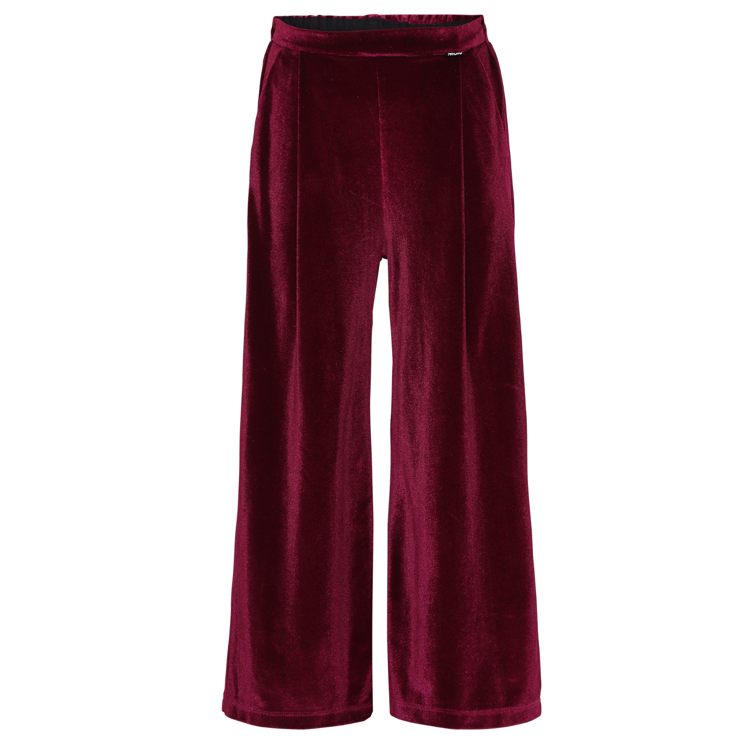 Alfa er et par mørkerøde velour bukser med en løs pasform. Bukserne har en elastisk talje. Kombiner bukserne med den matchende t-shirt.