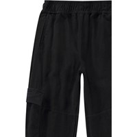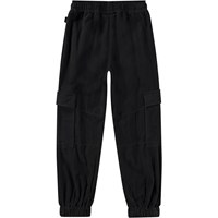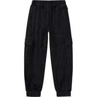 Sorte cargobukser i økologisk bomuld med elastik i taljen og bunden for en flot og løs pasform. Bukserne har fine snit ved knæene, store cargolommer på siderne og en indvendig snøre i taljen for en god pasform til alle børn.
