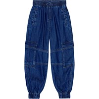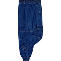 Denimblå cargobukser i økologisk bomuld med elastik i taljen og bunden for en flot og løs pasform. Bukserne har fine snit ved knæene, store cargolommer på siderne og en indvendig snøre i taljen for en god pasform til alle børn.