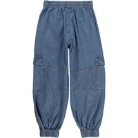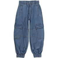 Blå cargobukseri bomulds chambrey. Disse bukser er fremstillet i 100% bomuld, har elastik og bindebånd i taljen, lommer i siden, cargolommer på lårene, elastik ved fødderne, samt et regulært fit.