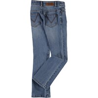 Aliza er et par mellem blå jeans med let svaj i benene. Bukserne har for og baglommer. Bemærk, at størrelserne til og med 134 har trykknap og ikke almindelig jeansknap.