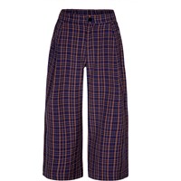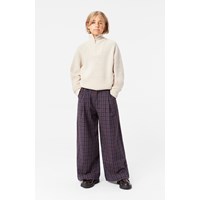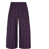 Klassiske, brune og blå ternet bukser med en bred og løs pasform. Bukserne har lommer og læg foran, hvilket giver dem ekstra volumen. De er nemme at tage på med knap og lynlåslukning og behagelige at have på med den elastiske talje. Du kan kombinere bukserne med en matchende blazer i samme materiale og skabe et stilfuldt sæt.