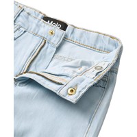 Lyseblå denim bukser med elegante flæsedetaljer ved lommerne og forneden på benene. Modellen har fire lommer, bæltestropper og en justerbar elastik i taljen for optimal pasform. De mindste størrelser (92-134) har en praktisk trykknap, mens størrelser 140-176 er udstyret med en klassisk jeansknap.