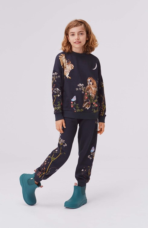 Amina er et par mørke sweatpants med print af forskellige bær, blomster og fugle. Kombiner bukserne med den matchende sweatshirt.