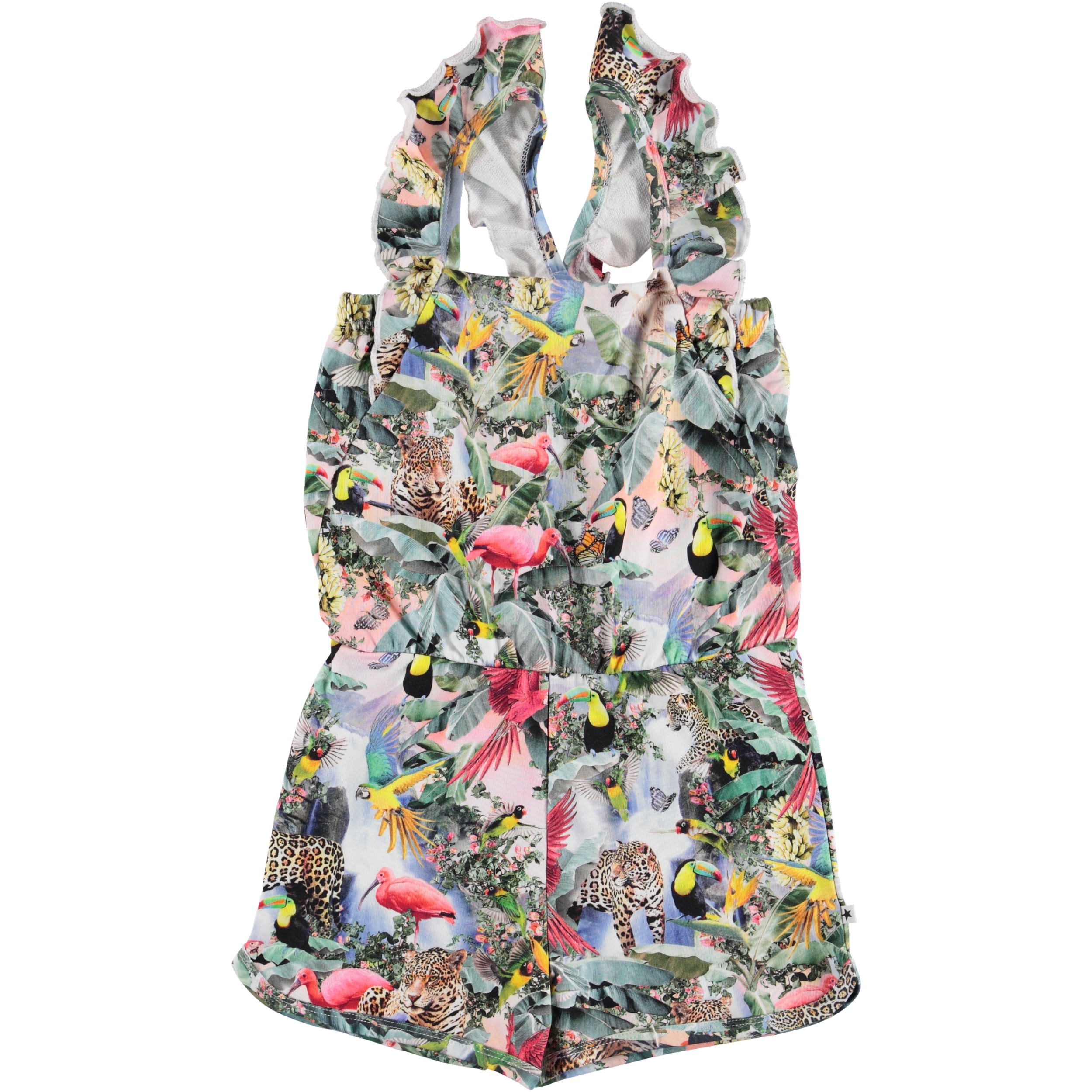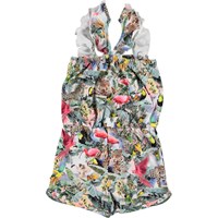 Få en bid af Sydamerika og verdens største regnskov med printet 'Wild Amazon' her på jumpsuitet Anita. Jumpsuiten har korte ben og stropper med flæse stof.