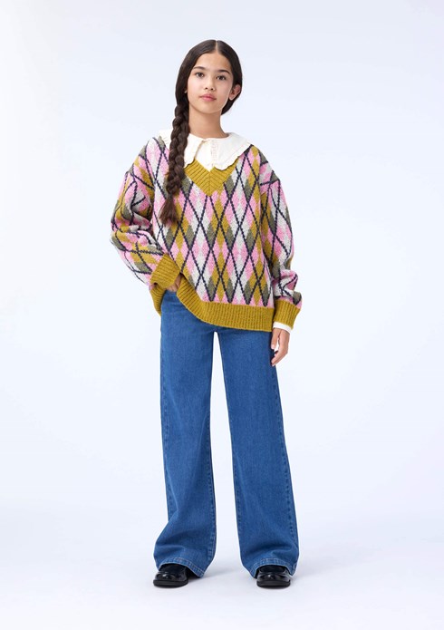 Blå jeans i økologisk bomuld med stretch, 5 lommer, brede ben og en almindelig pasform.