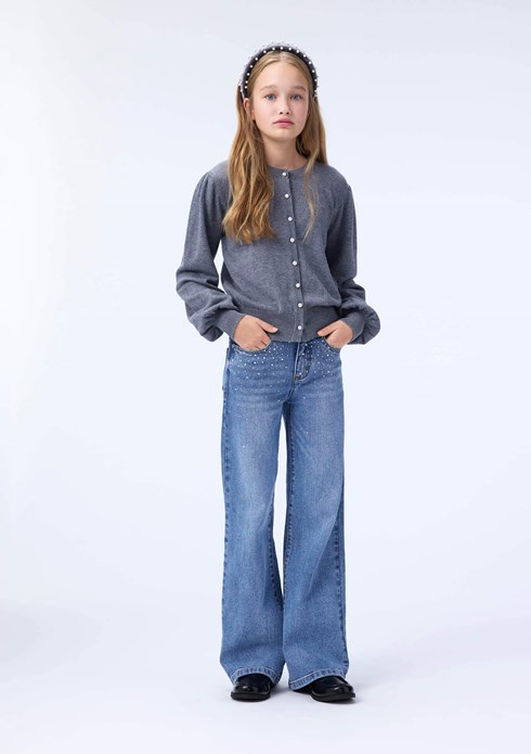Blå jeans i økologisk bomuld med stretch, 5 lommer, brede ben og en almindelig pasform. Bukserne er pyntet med similisten både foran og bagpå.