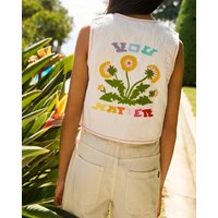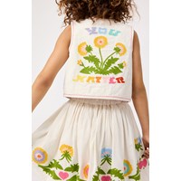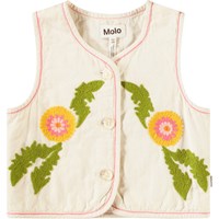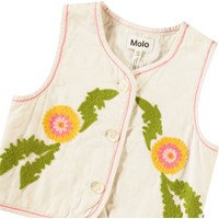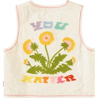 Sandfarvet, foret vest i blød bomuld med rund halsudskæring, knaplukning foran samt lyserøde stikninger ved ærmegabene og langs kanten, som giver en flot finish. Vesten har et farverigt broderi af mælkebøtteblomster og teksten 'You Matter' på ryggen.
