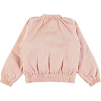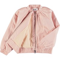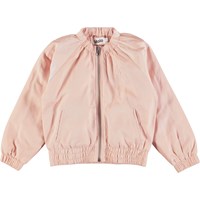 Yndig, rosa bomber jakke med en shiny overflade. Jakken har lynlås ned langs fronten, lommer i siden og elastiske kanter ved hals, ærmeafslutning og bund.