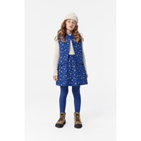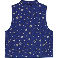 Marineblå vatteret vest i blødt bomuld med kinakrave og store ærmegab. Der er plads til en trøje inden under. Vesten har en knaplukning fortil og små broderede guldstjerner, som giver den et eksklusivt look. Kombiner vesten med en matchende nederdel for at få et eksklusivt sæt.