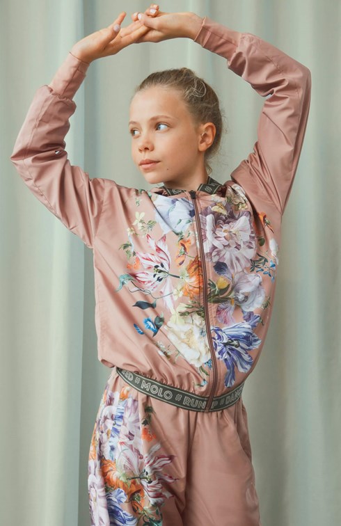 Ophelia er en luftig sportsjakke i rosa med blomster print. Jakken har lynlås lukning og hætte, samt brunt kantebånd med tekst. Jakken er en del af Molo's sportskollektion, som er med til at binde mode og sport tættere sammen. Kombiner Ophelia med en af de matchende styles fra Molo's sportskollektion for et komplet og cool look. Molo’s sportskollektion er fremstillet med en unik high-performance teknologi kaldet HeiQ Smart Temp, der understøtter kroppens naturlige nedkøling. Kølefunktionen aktiveres, når duer varm og svedig. Kølefunktionen deaktiveres, når kroppen er nedkølet. HeiQ Smart Temp sikrer optimal komfort og ydeevne. Testet uafhængigt som sikkert for huden.