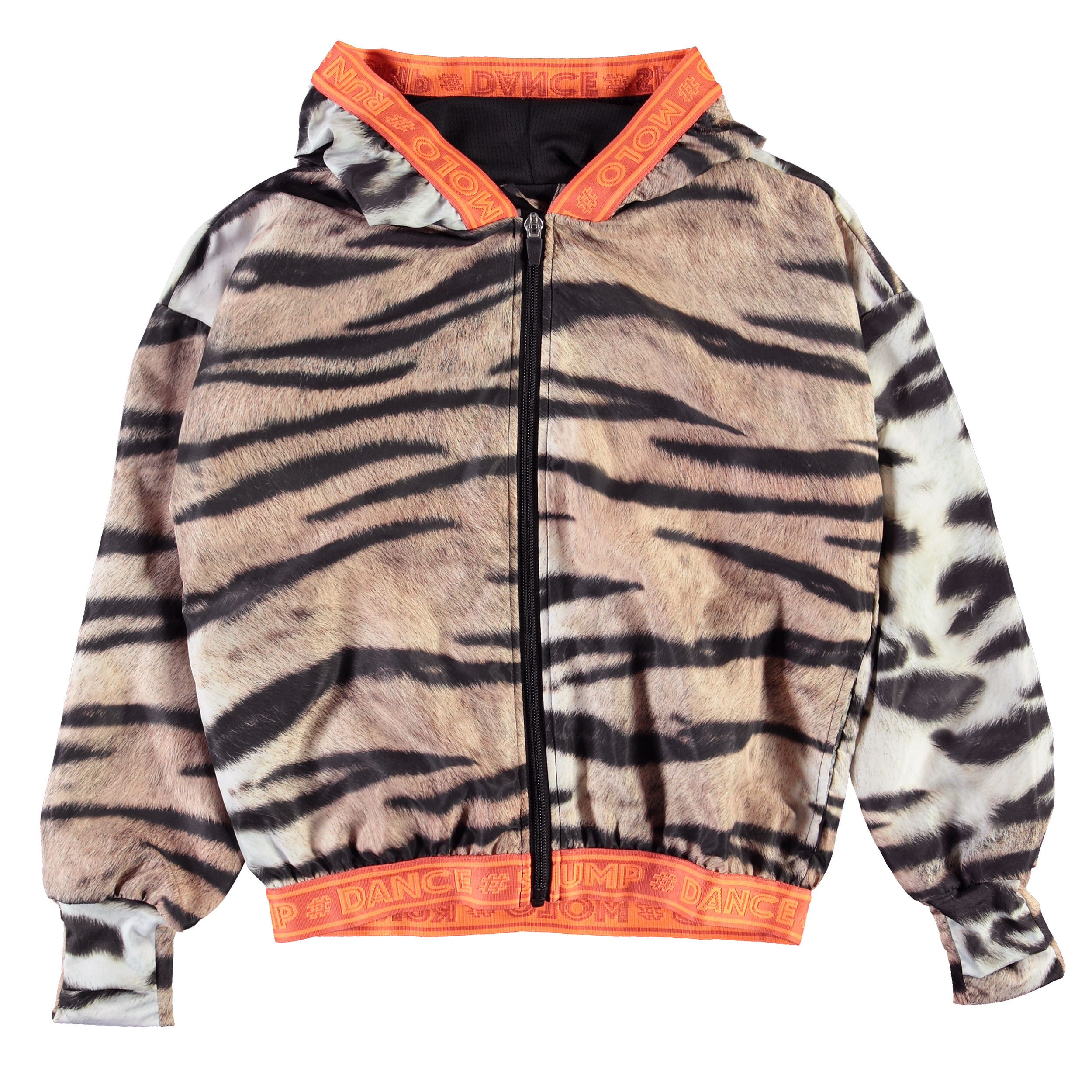 Ophelia er en luftig sportsjakke med cool tiger print. Jakken har lynlås lukning og hætte, samt orange kantebånd med tekst. Jakken er en del af Molo's sportskollektion, som er med til at binde mode og sport tættere sammen. Kombiner Ophelia med en af de matchende styles fra Molo's sportskollektion for et komplet og cool look. Molo’s sportskollektion er fremstillet med en unik high-performance teknologi kaldet HeiQ Smart Temp, der understøtter kroppens naturlige nedkøling. Kølefunktionen aktiveres, når duer varm og svedig. Kølefunktionen deaktiveres, når kroppen er nedkølet. HeiQ Smart Temp sikrer optimal komfort og ydeevne. Testet uafhængigt som sikkert for huden.