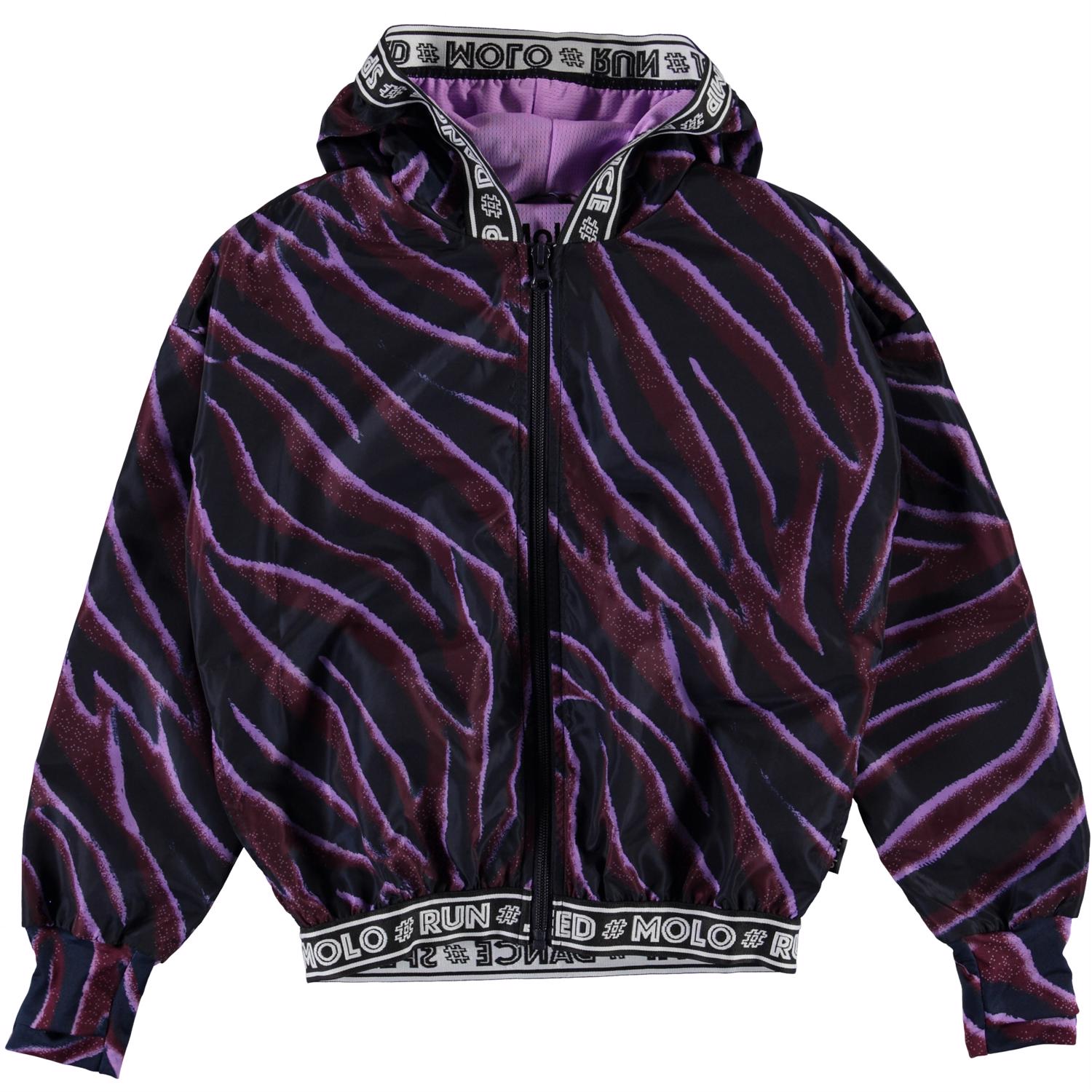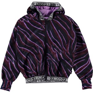 Ophelia er en luftig sportsjakke med print af zebra striber i blå, lilla og bordeaux. Jakken har lynlås lukning og hætte, samt kantebånd med tekst. Jakken er en del af Molo's sportskollektion, som er med til at binde mode og sport tættere sammen. Kombiner Ophelia med en af de matchende styles fra Molo's sportskollektion for et komplet og cool look. Molo’s sportskollektion er fremstillet med en unik high-performance teknologi kaldet HeiQ Smart Temp, der understøtter kroppens naturlige nedkøling. Kølefunktionen aktiveres, når duer varm og svedig. Kølefunktionen deaktiveres, når kroppen er nedkølet. HeiQ Smart Temp sikrer optimal komfort og ydeevne. Testet uafhængigt som sikkert for huden.