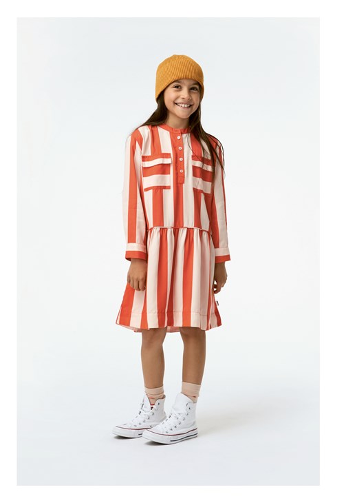 Cacao er en stribet kjole i beige og rød. Kjolen har lommer på brystet, samt knappelkukning ved kraven.