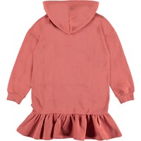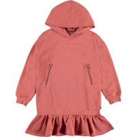 Cachea er en sweatshirt inspireret kjole i rød med hætte og lang ærmer. Kjolen har lynlås lommer på fronten og et lille flæse skørt i bunden.
