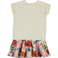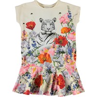 Caeley er en lys kjole med print af en hvid tiger, som ligger mellem en masse blomster. Certificeret af Ecocert Greenlife, certifikationsnr. 197496.