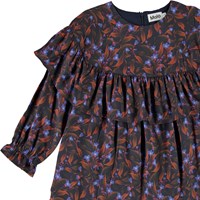 Cailin er en mørk langærmet kjole med print af små blå blomster med rødlige blade. Kjolen har flæsekant rundt om brystet og skuldrne, samt i bunden af kjolen.