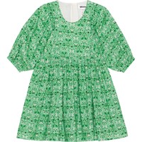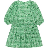Løs grøn kjole i økologisk bomuld. Kjolens overdel har rund hals med trekvart lange ærmer der lukkes med en lille knap bagpå. Kjolen har en skæring midt på med masser af rynk, der gør skørtet voluminøst. Kjolen er nem at komme i med den usynlige lynlås bagpå. Print af Blomster og planter der danner hjerter i materialet.