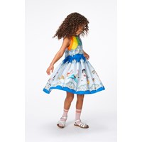 Ærmeløs kjole med rundskåret skørt i økologisk bomuld. Kjolen har rund hals, usynlig lynlås bagtil er i ribbet jersey, og er tætsiddende mens skørtet er i bomuldspoplin med et print af sælunger og Nemofisk i et fantasifuldt koralrev.