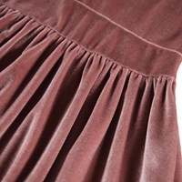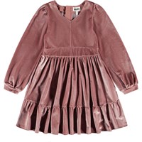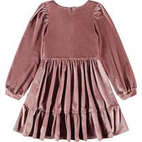 Knælang rosa velourkjole med lange ærmer og V-udskæring ved halsen. Kjolen har et bredt taljestykke, der giver en tætsiddende pasform, mens flæseskørtet falder flot i den bløde velour. Den usynlige lynlås gør kjolen nem at få på.