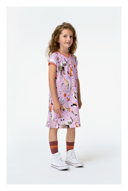 California er en lyse lilla kjole med korte ærmer, v-udskæring og stibet ribkanter. Kjolen har print af forskellige dyr som dyrker sport.