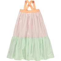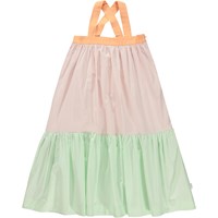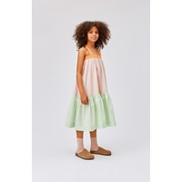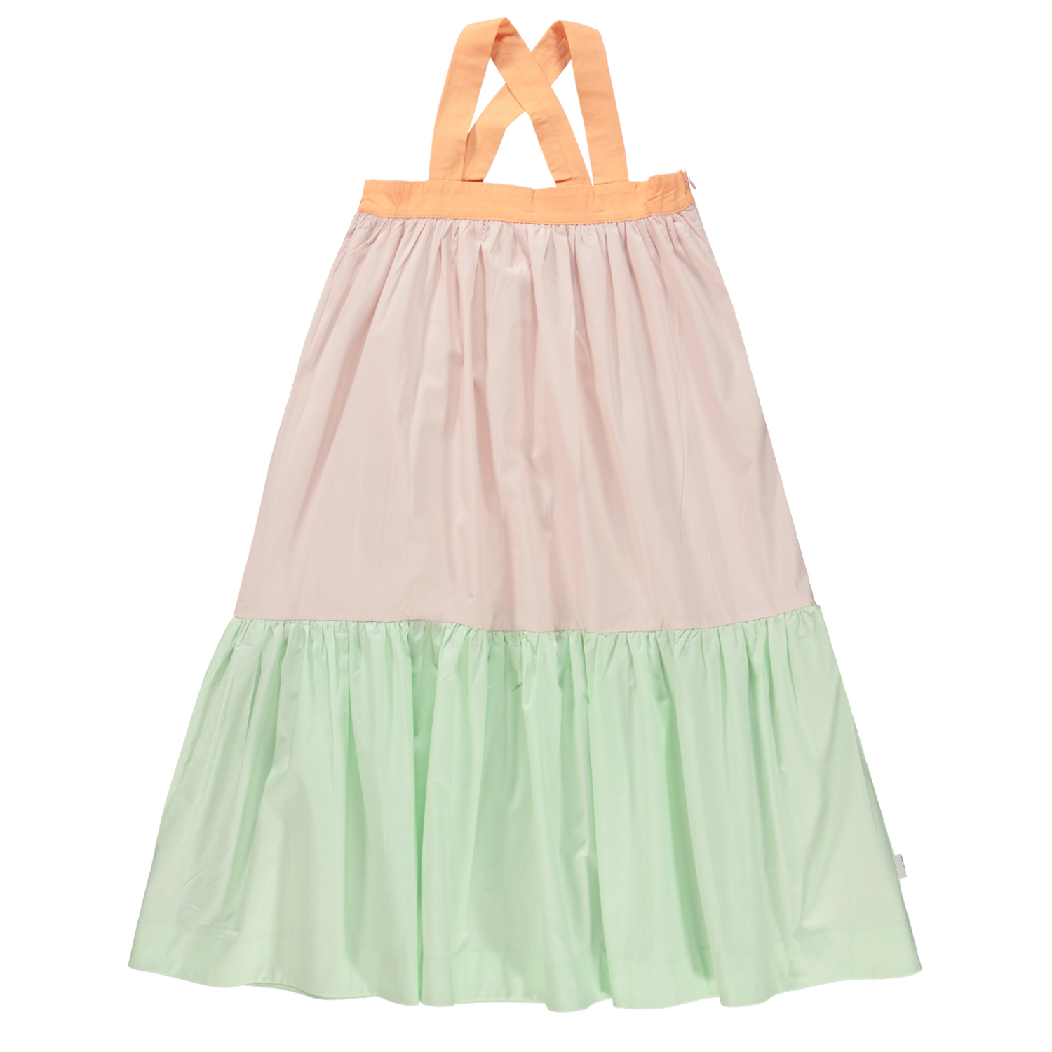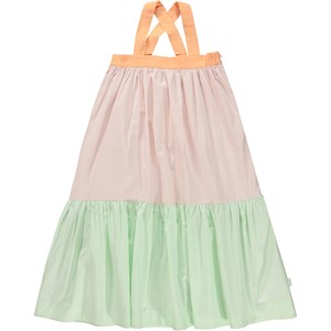 Calipsa er en lang kjole i økologisk bomuld med stropper. Stropperne er en lys orange, sidder fast på bærestykket og krydser på ryggen. Kjolen har dropped waist og det nederste skørt er mintgrønt, mens selve kroppen er sart lyserød.