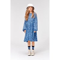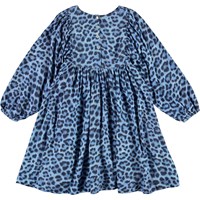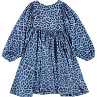 Caly er en blå kjole med leoprad print. Kjolen har store volumiøse ærmer og lynlås lukning i nakken.