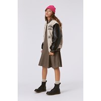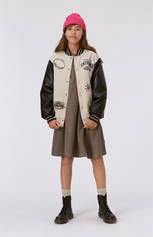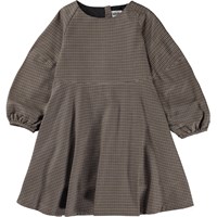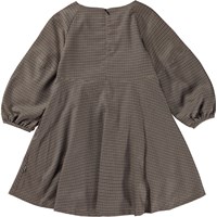 Brun knælang kjole med lange ærmer og tern. Denne kjole er fremstillet i en polyester/viskose blanding, har foer i 100% bomuld, en rund halsudskæring med skjult lynlås på ryggen, raglan snit, ærmer med volume og smal manchet, A-line skørt, samt et loose fit.