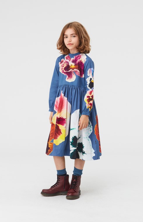 Cami er flot blå poplin kjole med print af store blomster på front, bagside og ærmer. Kjolen har en flot volumen og en lille plisseret krave, samt lynlås lukning i nakken.