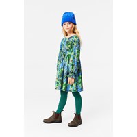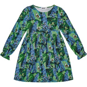 Grøn økologisk bomuldskjole med løs pasform, rund hals og lange ærmer med flæsekant. Masser af rynk i skørte for bevægelsesfrihed. Alloverprint af blålilla sommerfuglebuske med farverige sommerfugle.