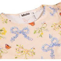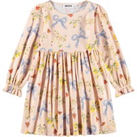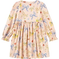 Lyserød jerseykjole i blød, økologisk bomuld med rund hals, lange ærmer og en fin flæsekant ved håndleddene. Kjolen har en løs pasform og et rynket skørt med et farvestrålende blomsterprint, der giver et legende og let udtryk.