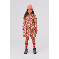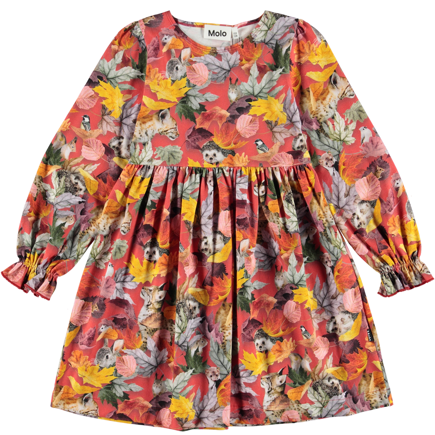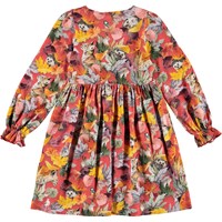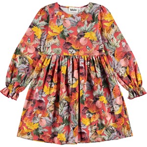 Camie er en rød kjole med print af forskellige dyr og farvede blade. Kjolen har elastisk talje og armeafslutning.