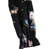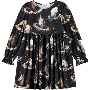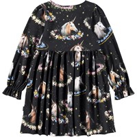 Sort jerseykjole i økologisk bomuld med løs pasform, rund hals og lange ærmer med en lille flæsekant. Kjolens skørt har masser af rynk og et print af enhjørninger og blomster.