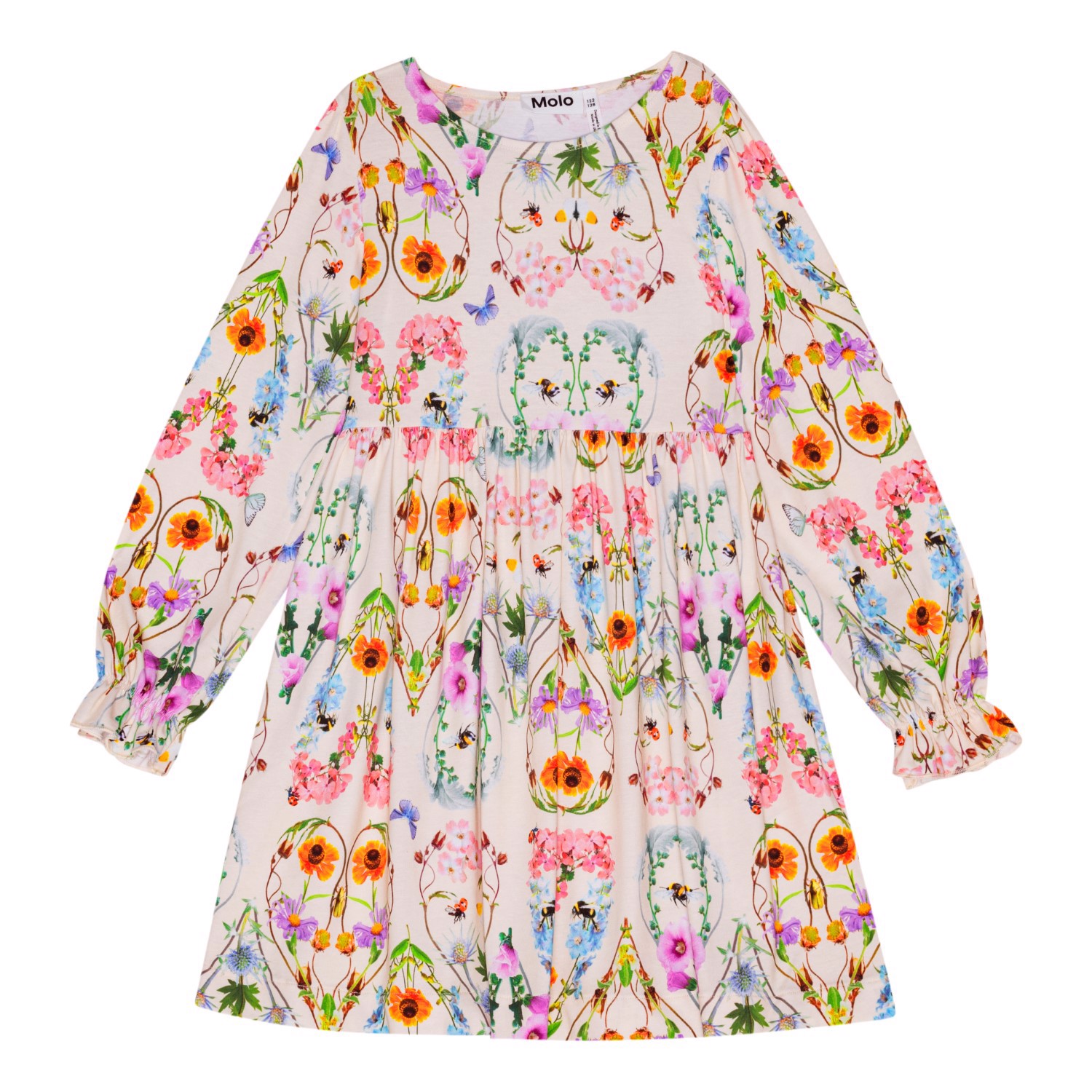Råhvid jersey kjole i økologisk bomuld. Kjolen har en løs pasform, rund hals og lange ærmer med en lille flæsekant. Kjolens skørte har masser af rynk og falder flot i den runge jersey. Kjolen har et alloverprint af multifarvet hjerter der er dannet af insekter og vilde blomster.