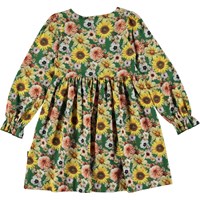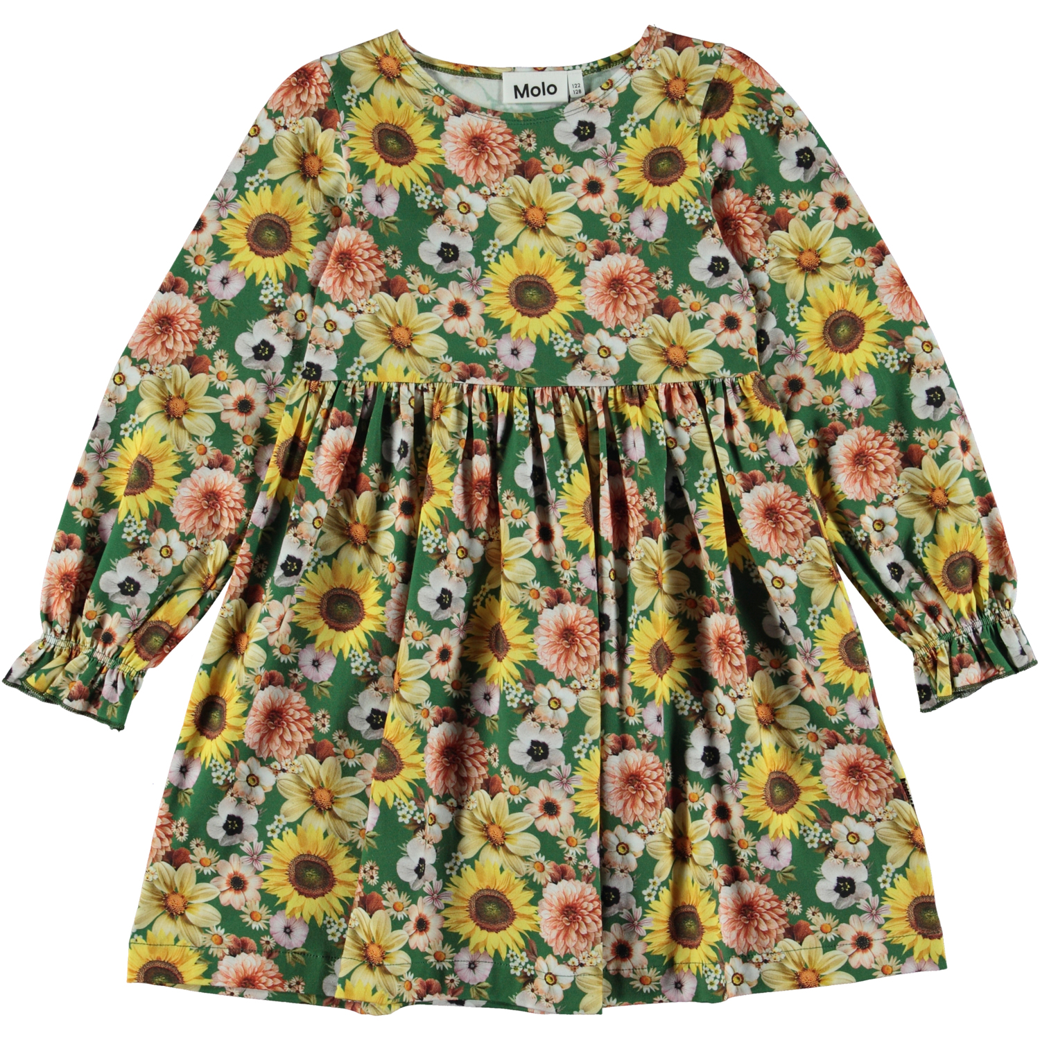 Grøn knælang kjole med allover blomsterprint. Printet består af en masse forskellige blomster, som fx solsikker og geoginer, i lyserøde og gule nuancer. Denne kjole er fremstillet i 100% bomulds jersey, har en rund halsudskæring, lange ærmer med flæsedetaljer, en høj talje, et skørt med masser er swing, samt et loose fit.
