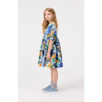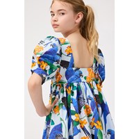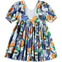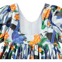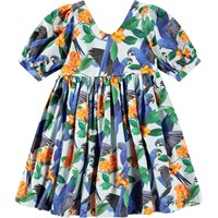 Lyseblå knælang kjole i økologisk bomuld med rund hals og en dyb firkantet udskæring i ryggen. Kjolen har en løs pasform, pufærmer med manchet og knaplukning bagpå samt en usynlig lynlås i siden, der gør den nem at få af og på. Kjolen har et farverigt allover print af blå papegøjer og orange blomster.