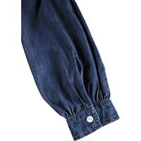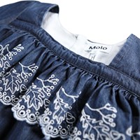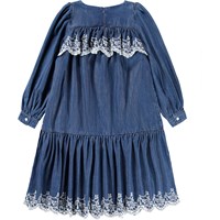 Langærmet blå kjole i økologisk bomulds-chambrey. Kjolen har en firkantet udskæring, flæsekant på brystet, ærmer med rynket afslutning og knaplukning. Kjolen har detaljer med hvid broderi anglaise på både flæsekant og skørtets bund. Den usynlige lynlås bagpå gør den nem at iføre sig.