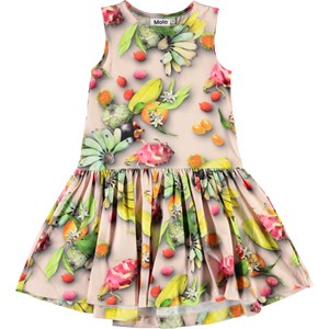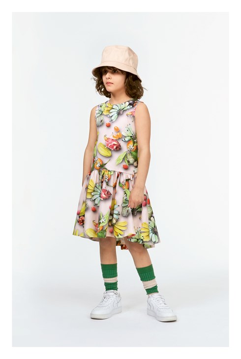 Candece er en kjole i printet 'Tutti Frutti', som er fyldt med tropiske frugter. Kjolen har en tanktop inspireret overdel og skørt med vidde og mere længde bagtil.