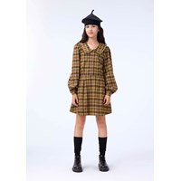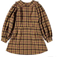 Langærmet kort kjole i gul og brun tern. Kjolen har en fin rund krave med flæsekant, påsyet rundskåret skørt og fine ærmer der afsluttes med små rynker og bånd med knaplukning. Kjolen har usynlig lynlås bagpå hvilket gør den nem at iklæde sig.