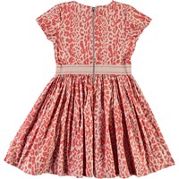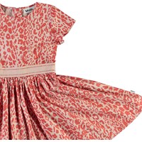 Candy er en poplin kjole med stretch i, som gør den utrolig behagelig at have på. Candy er med korte ærmer og med rødt leopard print på en lyserød baggrund. Kjolen har lynlåslukning i nakken og lyserødt taljebånd. Certificeret af Ecocert Greenlife, certifikationsnr. 197496.