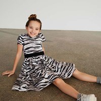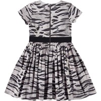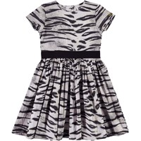 Kjole i økologisk bomuld med sort og hvidt tigerprint. Kjolen har korte ærner og i taljen er en bred sort elastik, der sammen med det volumiøse plisserede skørt, giver en flot silhouet. Kjolen er i poplin med stretch, hvilket gør den ekstra behagelig at have på. Kjolen har ligeledes en praktisk lynlåslukning på bagsiden. På det ene ærme er et påtrykt gult Panthera logo.