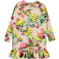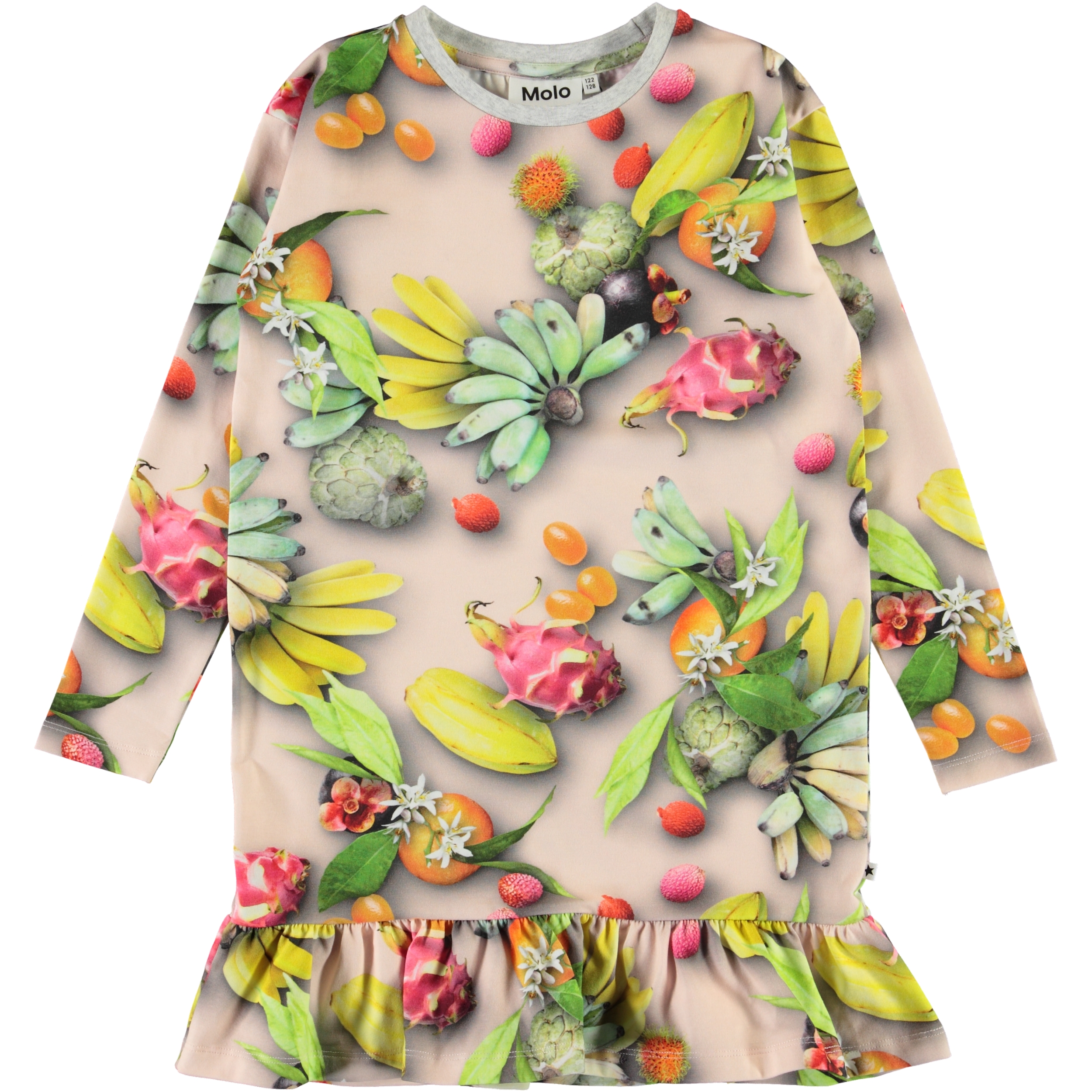 Caras er en kjole med lange ærmer og lille skørt i printet 'Tutti Frutti', som er fyldt med tropiske frugter.