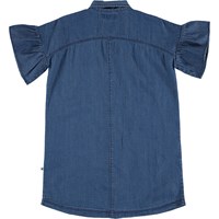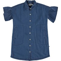 Carey er en skjortekjole i indigo blå denim. Kjolen har korte flæseærmer og stor front lommer.