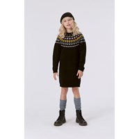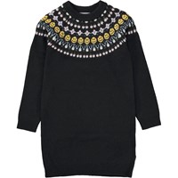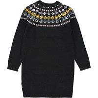 Sort strikkjole med nordisk inspireret mønster på kraven. Mønstret er inspireret af nordiske striktraditioner, men med et sjovt Molo-tvist. Denne strikkjole er fremstillet i en blød uld blanding, som gør den perfekt til de koldere dage. Den har rund halsudskæring med ribstrik, lange ærmer med ribskrik for enden, samt et regulært fit. Hvis du fryser om ørerne, kan du nemt matche denne kjole med huen, Kamma, i samme mønster, for et cute look.