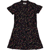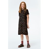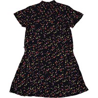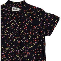 Caris er en sort skjortekjole med farverigt stjerneprint. Kjolen har korte ærmer, krave og knappe åbning ved halsen.