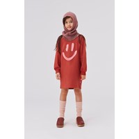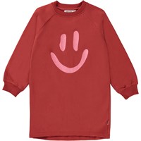 Carola er en rød sweatshirt kjole med lange ærmer. Kjolen har print af en pink smiley på fronten.