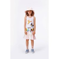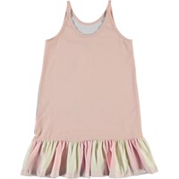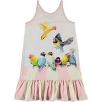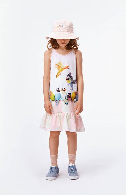 Carrie er en rosa stropkjole med print af søde små fugle.  Certificeret af Ecocert Greenlife, certifikationsnr. 197496.